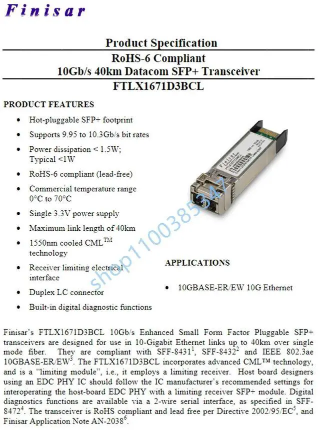 • Finisar 10GB 40KM Fiber Optical Module FTLX1671D3BCL/1550NM 40KM 10G Network Adapter General Purpose Module