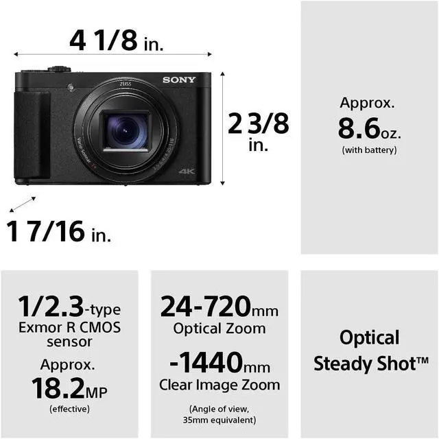 Sony cyber-shot HX99 travel high zoom camera with 24-720mm Zeiss zoom lens, 18.2MP back-illuminated Exmore R CMOS sensor, advanced BIONZ x image-processing engine, fast intelligent AF, 4K video, pop-up EVF, eye AF, control ring