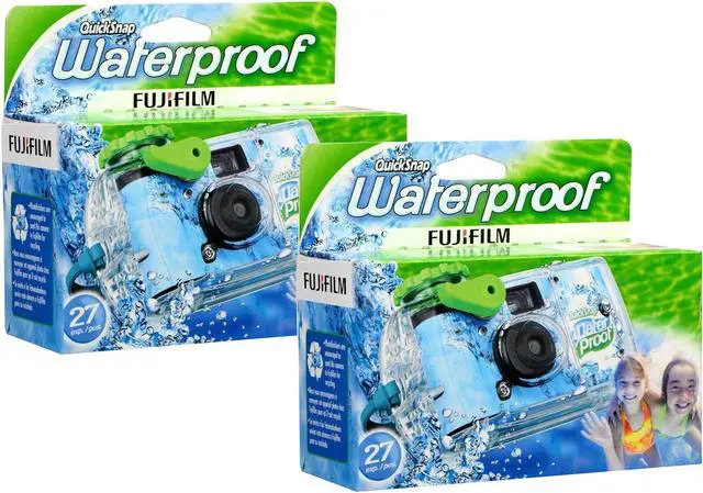 2X FUJIFILM QUICKSNAP WATERPROOF ONE-TIME USE CAMERA - 27 EXPOSURES Fujifilm QuickSnap Waterproof One-Time Use Camera - 27 Exposures This all-weather camera is ready for anything. It's ideal for shooting outdoors in wet and snowy conditions, and even operates up to 35 feet underwater! It comes pre-loaded with Fujicolor Superia X-TRA 800 35mm film and has a larger-sized shutter release for easy operation.