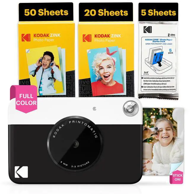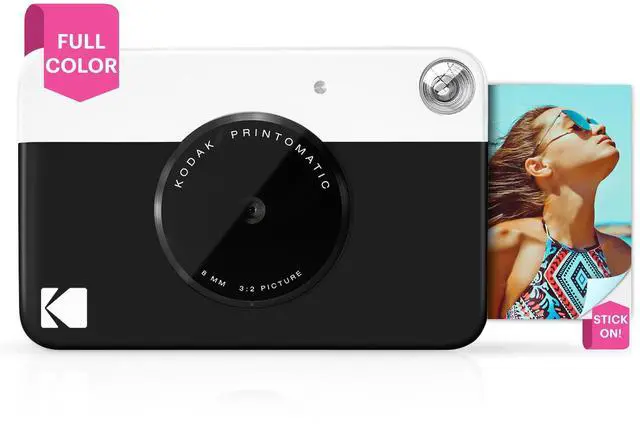 The Kodak Printomatic Mini Instant Camera prints smudge-proof, water- and tear-resistant photos up to 5 MP automatically. With this Kodak instant camera, you just point, shoot, and print. Perfect for taking on the go, whenever you want to share prints, the Kodak Printomatic Wireless Mini Instant Camera is the easiest way to share photos with friends. This mini digital camera's compact design slips neatly into your shirt pocket. The portable camera speed even allows you to continue shooting while your photo is printing. The "Insta Camera" Zero Ink technology means you don't need to worry about messy print cartridges, film, or toner. With this instant picture camera your prints are adhesive-backed, so you can get creative and use the photos to decorate, just as you would any sticker. Forget cumbersome printers just point and shoot the instant photo camera with you everywhere.