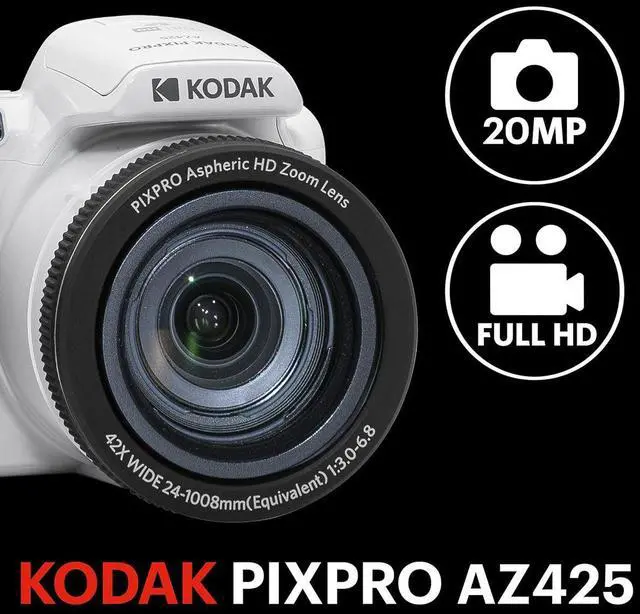 The KODAK PIXPRO AZ425 Astro Zoom Digital Camera, bundled with a 32GB memory card and a stylish camera bag, is a powerful tool for capturing stunning, high-resolution images and videos. This sleek, white camera from the Astro Zoom Collection boasts a 20-megapixel sensor, ensuring every shot is packed with detail and clarity. The camera's 42x ultra-long zoom lens, complemented by optical image stabilization, delivers crisp, clear close-ups, as well as panorama shots and Full HD videos. Whether you're capturing a distant landscape or a close-up of a loved one, the PIXPRO AZ425 ensures you're never too far from the action.