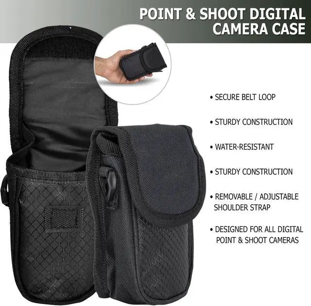 The Digital Point & Shoot Camera Caseis expertly crafted to provide superior protection and convenience for your digital camera. Featuring a water-resistant exterior, this case ensures your camera remains safe from moisture and the elements. Its durable construction and fully padded interior shield your device from bumps and scratches, while the secure belt loop and Velcro closure offer reliable carrying and quick access. The case also includes a removable and adjustable shoulder strap, allowing for flexible transportation options. With dimensions of 3.5 (W) x 2.25 (D) x 5.25 (H), this case is designed to fit all digital point-and-shoot cameras, making it an ideal choice for photographers seeking both functionality and style.
