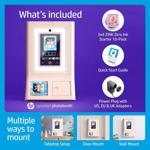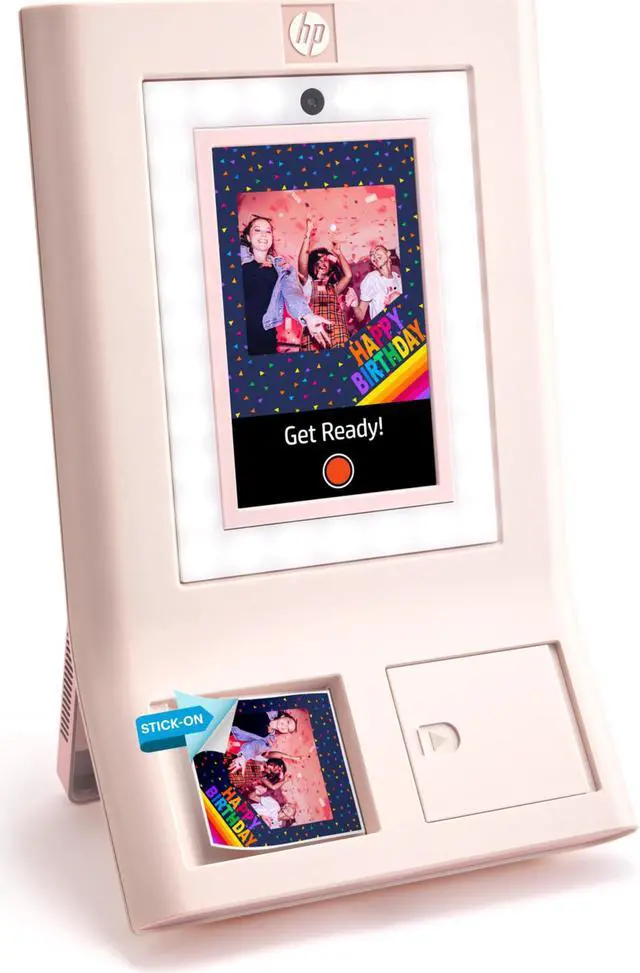 This one-of-a-kind photobooth instant photo printer lets you instantly take and share fun, customized photos on 3x4 sticky-backed photo paper. Simply choose from the available categories of the portable wireless printer to find the perfect layout for your event, select and customize your frames and filters and get the photobooth magic started! The 10.1 adjustable LCD touch screen of the HP Photo Printer offers a live view of your photos with layouts and filters applied, so you can make sure your photo looks just right before capturing the moment. And, with an LED ring light and flash built-in, you can confidently capture every detail in clear, bright color. When your photo is ready, sharing is easy. Simply hit print on the instant picture printer and watch as your photo instantly prints without the need for expensive ink or toners on ZINK paper. With this portable photo printer, your sticky-backed prints come out smudge-proof, water-resistant, and tear-resistant, so you can stick them anywhere and know theyll last. Connect to Wi-Fi and easily generate a QR code for fast and easy photo sharing and downloads. With this HP Sprocket Photo Printer your can snap, print, and share the instant photo fun!