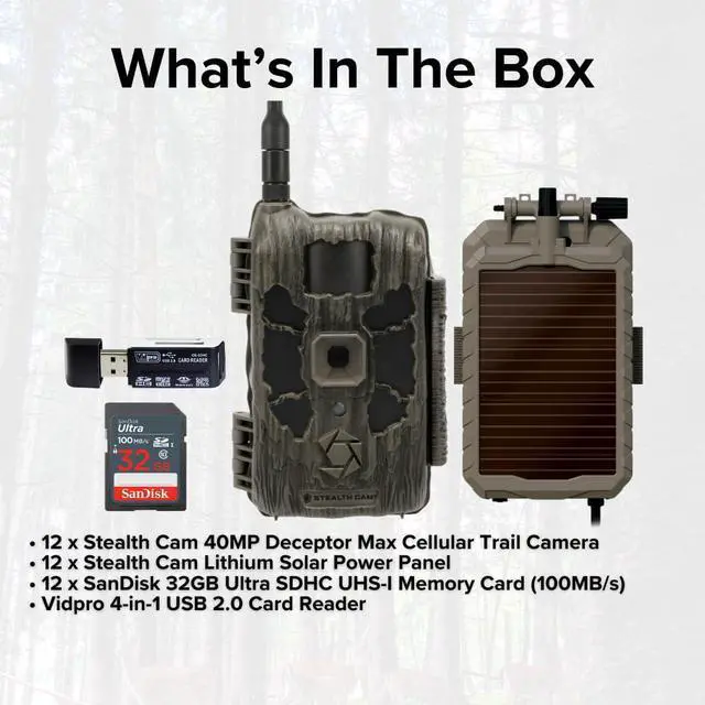 Stealth Cam has further refined the cellular camera segment by introducing the all-new Stealth Cam 40MP Deceptor Max Cellular Trail Camera (2-Pack). Now with an expanded battery capacity for 16 AA batteries (not included), the Deceptor MAX drastically improves your efficiency afield. It is compatible with Stealth Cams upcoming FieldMAX assortment of rechargeable lithium battery cartridges and solar panels. It features two pre-installed SIM cards and the Automatic Network Coverage feature that continuously monitors both AT&T and Verizon signal strength, ensuring automatic connection to the strongest network for connectivity you can count on via the Command Pro app. The on-demand photo and video capture takes and sends crystal-clear images and videos with audio in real-time, while the 36-piece, 940nm No-Glo LED array offers an invisible detection and flash range out to 80 feet. A 0.4-second trigger speed captures as many as nine photos per burst. It has a weatherproof housing integrated lock latch and a 1/4-inch threaded insert for adding mounting hardware.
