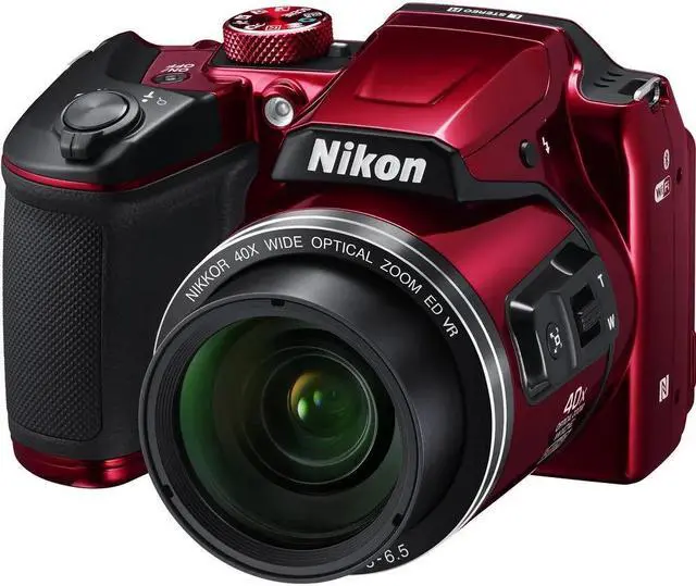 The red COOLPIX B500 Digital Camera from Nikon features a 16MP 1/2.3" BSI CMOS sensor for high-resolution imagery as well as Full HD 1080p video. This sensor's construction utilizes a stacked backside-illuminated design to improve clarity and image quality when working in dimly-lit conditions. The 40x optical zoom lens provides a 35mm equivalent focal range of 22.5-900mm, covering wide-angle to telephoto perspectives to suit working in a wide variety of environments. Further subject magnification can be achieved using the 80x Dynamic Fine Zoom that effectively doubles the camera's reach. The lens also features Vibration Reduction to help reduce the appearance of camera shake when shooting at the longer zoom lengths or with longer shutter speeds. A 3" 921k-dot tilting LCD screen allows image composition from unique angles, as well as image review and menu navigation.