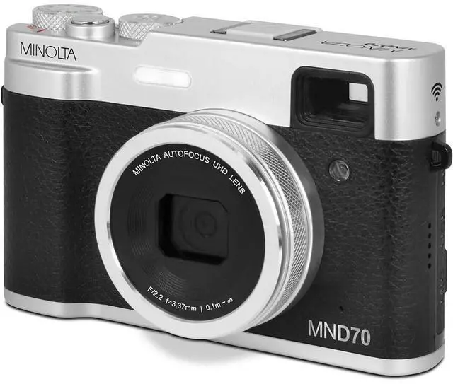 Find the perfect blend of vintage charm and modern technology with the Minolta MND70 Retro 48MP Wi-Fi 5K Ultra HD Dual Lens Digital Camera. This stylish camera is designed to capture life's moments with exceptional clarity and detail. Equipped with a powerful 48MP sensor, it allows you to snap vibrant photos that truly bring every scene to life. Record breathtaking 5K Ultra HD videos that capture every nuance and detail, ensuring your memories are preserved in stunning quality. The MND70's compact design, coupled with a robust 16x digital zoom, makes it an ideal choice for both wide-angle landscapes and detailed close-up shots, perfect for any adventure.