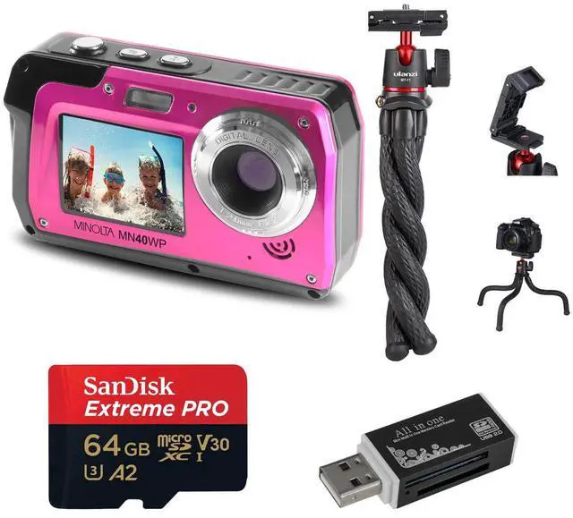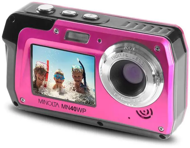 You can now immortalize your most cherished moments with the MN40WP 48MP QHD Dual LCD Screen Waterproof Camera in vibrant pink. This robust and innovative camera from Minolta is designed to capture high-resolution 48MP stills, allowing you to crop or enlarge your photos without compromising on image quality. Experience the richness of detail and vibrant color with 2.7K QHD video recording capabilities. This advanced camera boasts dual LCD monitors, a 3.0" main LCD, and a 2.0" selfie LCD, making it perfect for regular photo shooting or capturing intimate close-ups and selfies. The camera's compact size is complemented by a 16x digital zoom lens, enabling you to capture everything from wide-angle landscapes to telephoto shots.