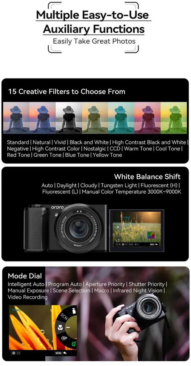 This camera boasts a 3.2-inch LCD screen, an optical viewfinder, and built-in Wi-Fi for seamless sharing and remote control via the "OD CAM" Connect app. It also offers Scene Intelligent Auto mode and Creative Auto mode with filters for easy and creative shooting.