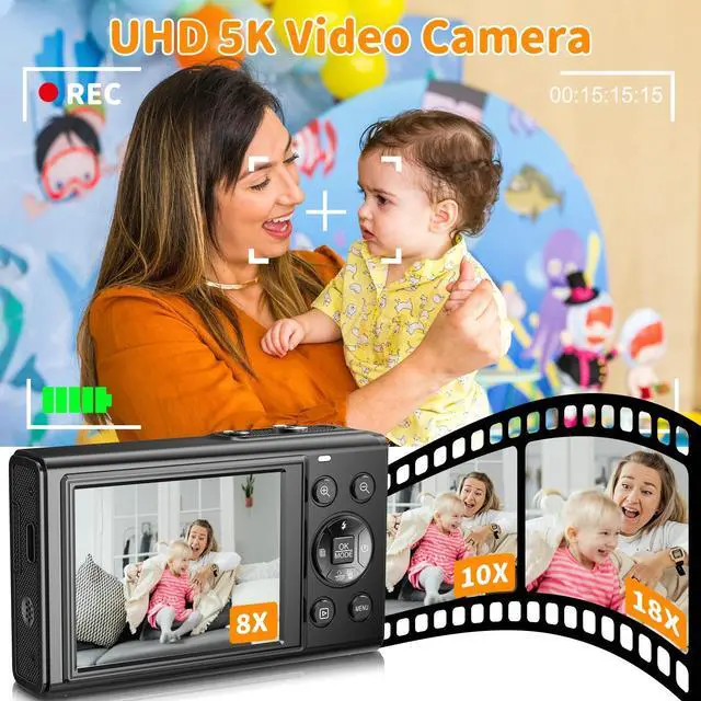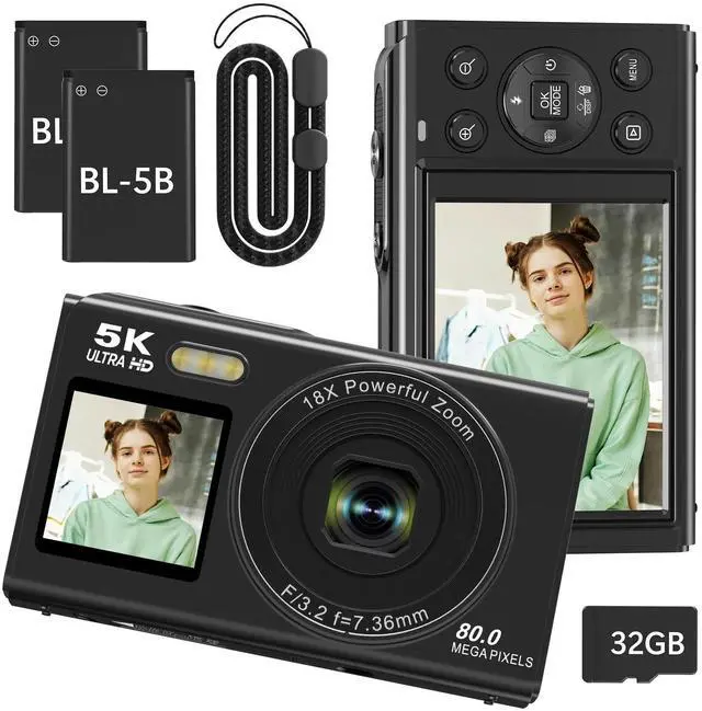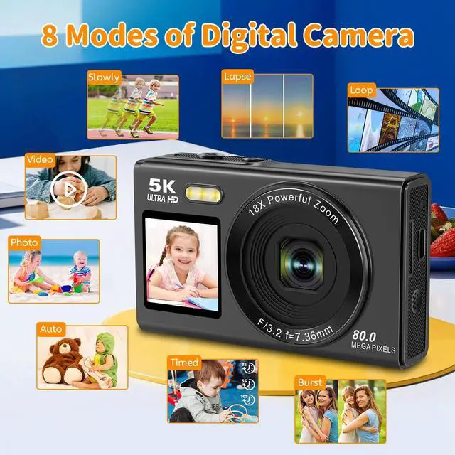 High Resolution: This digital camera offers FHD 5K video and 80 MP photo resolutions, enhanced by the latest CMOS sensor system and IPS true-color screen.