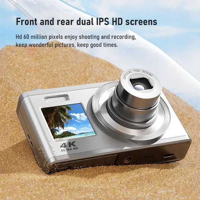 Stunning Image QualityCapture breathtaking photos with the 60MP high resolution, ensuring every detail is crystal clear and vibrant. Immersive 4K VideoRecord your precious moments in stunning 4K resolution (3840*2160), bringing your memories to life with exceptional clarity and realism. Dual IPS ScreensEnjoy a large 2.88in IPS screen for easy framing and reviewing, while the additional 1.58in IPS screen on the front allows for convenient selfies and vlogging. Intelligent AutofocusNever miss a moment with the automatic autofocus function, ensuring your subjects are always sharp and in focus. Continuous ModeCapture fast-moving action with the digital camera's continuous shooting mode, which lets you take multiple shots in rapid succession. Built-in FlashSeize every moment of fast-paced action with the camera's burst mode, allowing you to capture a series of shots in rapid succession. Powerful 16X ZoomCapture distant subjects with incredible clarity and detail due to the powerful 16X zoom feature, bringing them closer to you with just a click of a button. Perfect GiftThis camera comes with a hand strap, storage bag, 2 lithium batteries, and a 32GB memory card, making it an ideal gift for birthdays and special occasions.