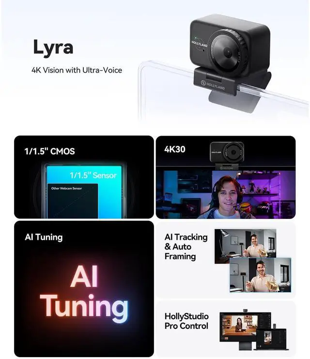The Hollyland Lyra UHD 4K Webcam delivers professional-grade image and audio capture for live streaming, conferencing, and content creation. Its large 1/1.5" CMOS sensor records UHD 4K video in up to 30 fps with natural detail and clarity, while AI-powered tracking and auto-framing keep subjects centered in frame without manual adjustment.