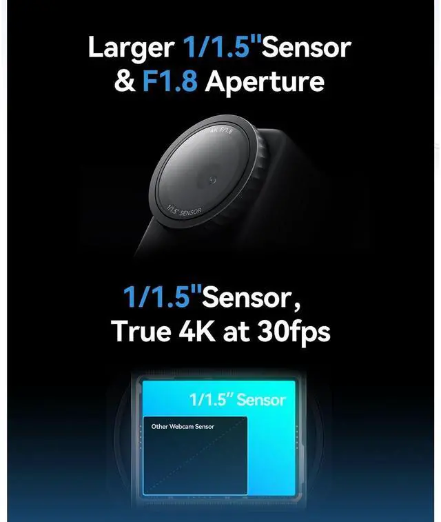 (1/1.5" CMOS) Most webcams use 1/3" or 1/2.5" sensors, struggling in low light. Lyra's 1/1.5" CMOS is 3x larger, capturing more light for crystal-clear video from sunrise to night.