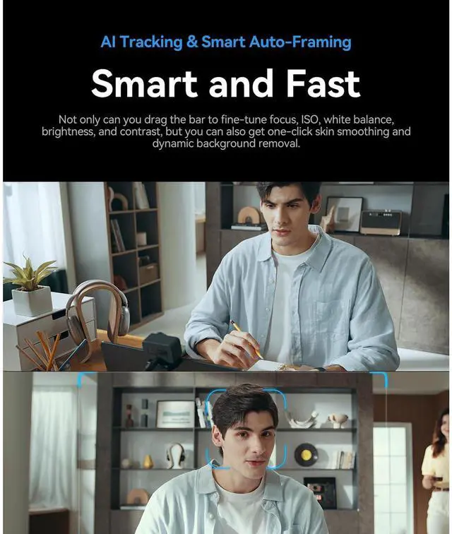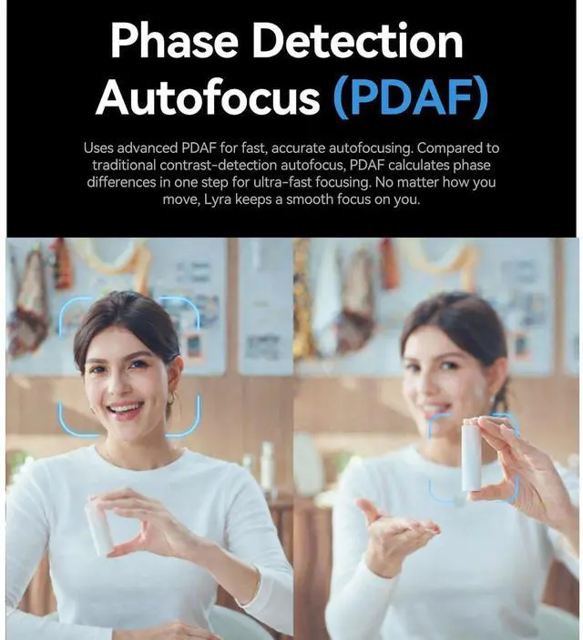 (Phase Detection Autofocus (PDAF)) The Lyra webcam uses advanced PDAF for fast, accurate autofocusing. Compared to traditional contrast-detection autofocus, PDAF calculates phase differences in one step for ultra-fast focusing. No matter how you move, Lyra keeps a smooth focus on you.