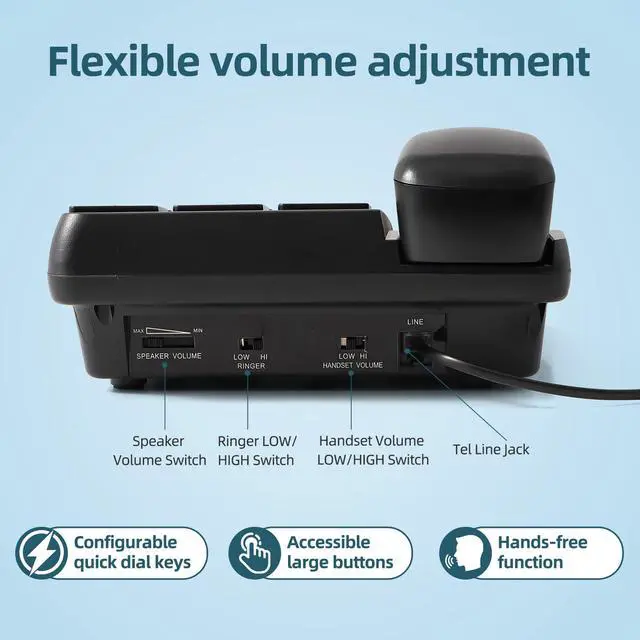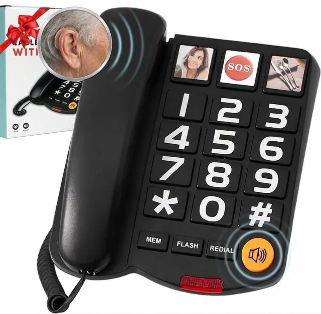 Corded Big Button Phone for Seniors, Hearing Aid Compatible, Configurable Picture Buttons, Extra Loud Ringer, for wall or desk with Speaker