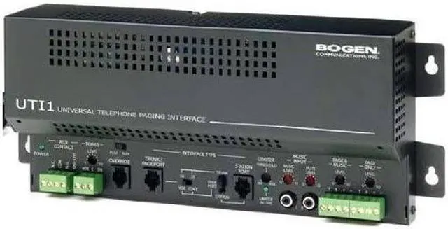 Bogen UTI1 Single Zone Universal Telephone Paging Interface Refurbished Includes 90 Day Warranty The Bogen UTI1 Single Zone Paging Controller is a universal telephone interface for use with one-way public address systems, such as powered speaker systems, sound reinforcement systems and 70V systems. The controller allows paging over a standard telephone and also features provisions for background music. With Two Audio Outputs, it features level controls and are capable of providing audio to 150 Bogen self amplified speakers. With telephone interfaces like loop start trunk, ground start trunk, station access (analog ring-up), page port contact closure activation, and page port voice activation, this UTI1 makes telephone paging easier.