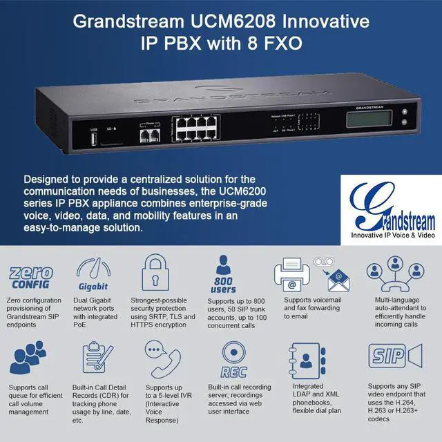 Supports up to 800 users, 50 SIP trunk accounts, up to 100 concurrent calls Zero configuration provisioning of Grandstream SIP endpoints Strongest-possible security protection using SRTP, TLS and HTTPS encryption Dual Gigabit network ports with integrated PoE+ Supports up to a 5-level IVR (Interactive Voice Response) Built-in call recording server; recordings accessed via web user interface Supports call queue for efficient call volume management Built-in Call Detail Records (CDR) for tracking phone usage by line, date, etc. Multi-language auto-attendant to efficiently handle incoming calls Integrated LDAP and XML phonebooks, flexible dial plan Supports any SIP video endpoint that using the H.