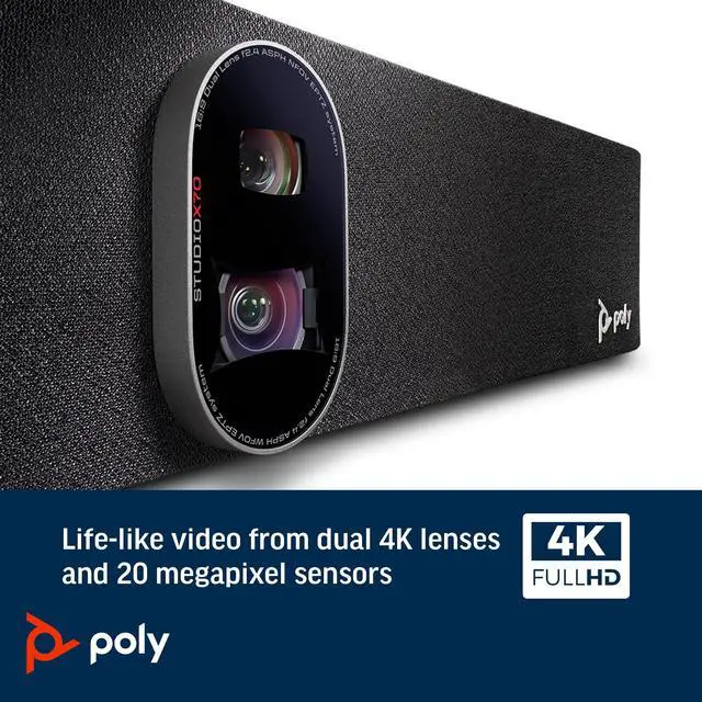 The Poly Studio X70, all-in-one video bar, offers quality audio and video performance in large meeting spaces. Enjoy pinpoint-accurate automatic framing and tracking modes, distraction-free audio technology, and lifelike 4K UltraHD video.