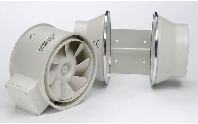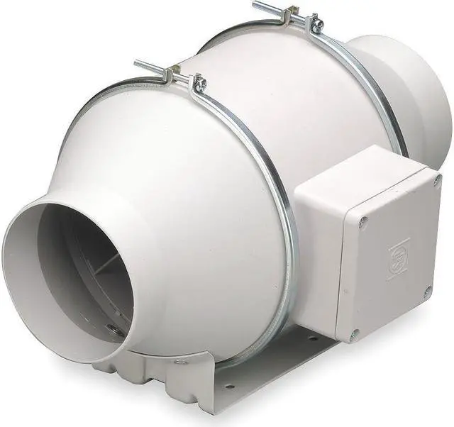 In-Line Duct Fan, For Fan Type In-Line Duct Fan, Airflow @ 0.000 in SP 101 cfm, Duct Diameter 4 in, Motor Output Power 26 W, Motor IP Rating IP44, Nameplate Voltage 120V AC, Phase 1, Number of Speeds 1, Overall Diameter 5 1/2 in, Overall Height 3 3/4 in, Overall Width 3 3/4 in, Application General Purpose, High-Efficiency Motor No, Housing Material Thermoplastic, Motor Speed 2, 500 RPM, Includes Mounting Bracket, Maximum Inlet Air Temperature 104 Degrees F, Speed Controllable Yes.