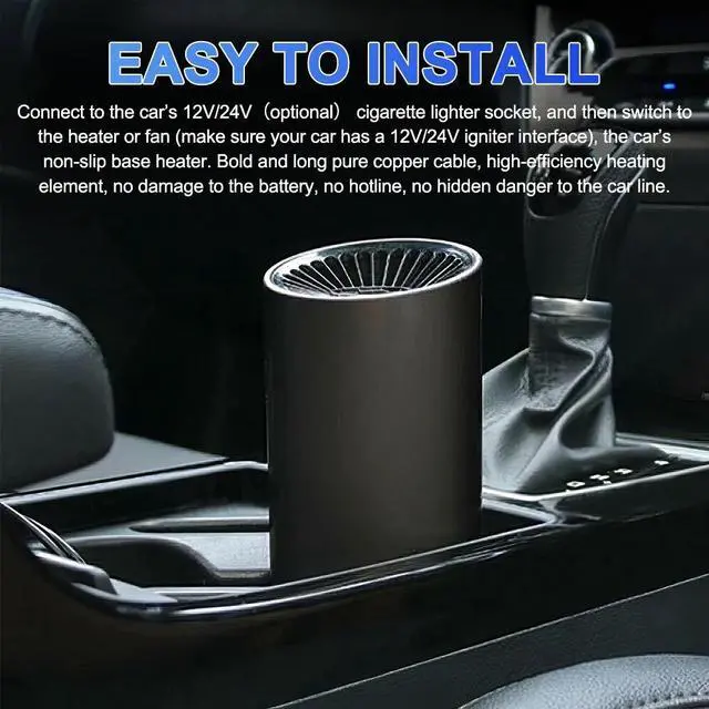 Install: Connect to the cars 12V cigarette lighter socket, and then switch to the heater or fan (make sure your car has a 12V igniter interface), the cars non-slip base heater. Bold and long pure copper cable, high-efficiency heating element, no damage to the battery, no hotline, no hidden danger to the car line.