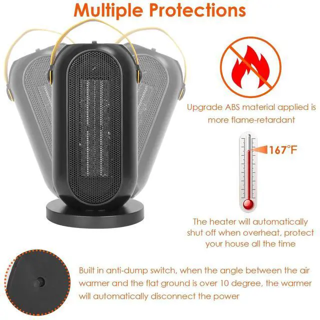 - *Protect Your Safety:Automatic overheating protection system will shut the electric heater off when the parts of the heater overheat. Adopt innovative PTC technology,ceramic heater cools down quickly to avoid overheating. The tip over protection system will also shut the heater off when the heater is knocked over by accident and it will come back on automatically if it stands up.