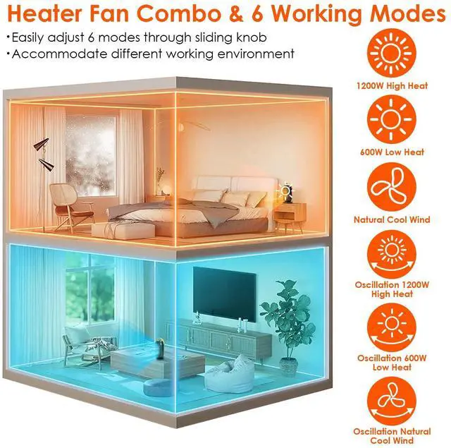 - *Effortless Control Fan Heater:Come with natural wind,low heat,high heat,oscillating natural cool wind,oscillating low heat and oscillating high heat mode,this space heater fan provides efficient coolness and heat into every corners of the house that needs constant wind in summer or heat in cold weather. Always keep your room temperature at the optimal level and reduce power consumption. High efficiency and low power consumptions.