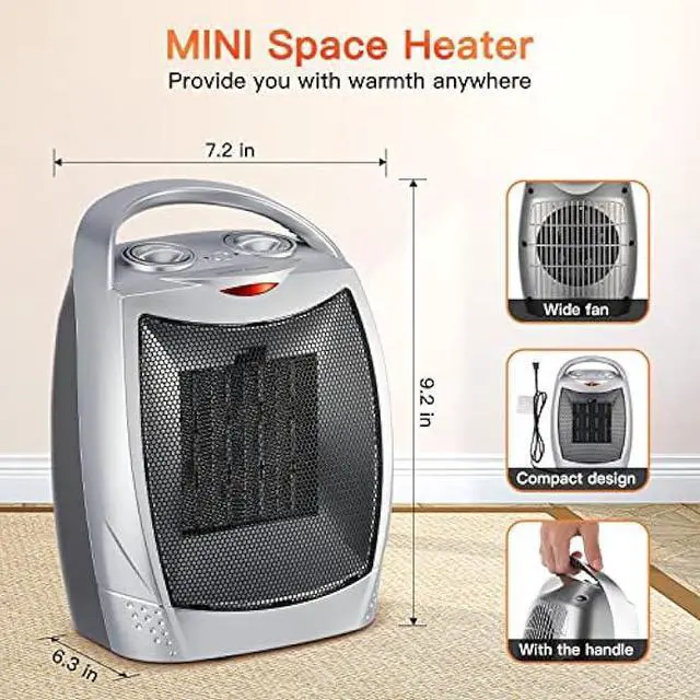 Dimensions: 8 x 6 x 10 inch. Easy carry handle and lightweight make this space heater easy to place in room or move from the floor to the table. No more concern about taking up too much space in a crowded place. An ideal space heater for office and a thoughtful gift for friends and family in winter
