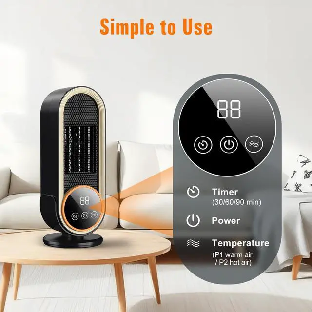 Smart Control Convenience, Easy to UseThe room heater allows you to adjust temperature of 2 heat levels and 3 timer settings not only by the included remote control from a distance, but also through touching the digital panel on the heater body. For an added convenience, there is hidden handle on the back of the space heater for effortlessly carrying and placing anywhere. The digital display clearly shows the heat level and operating status, making it easy to use.