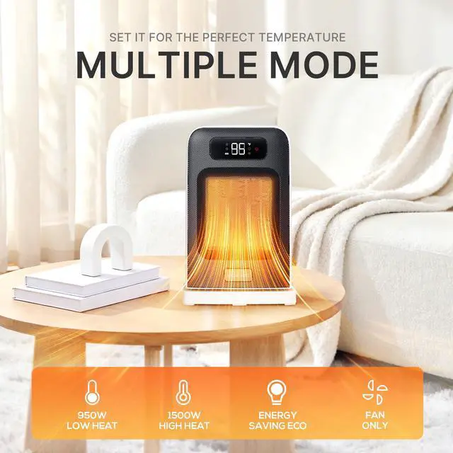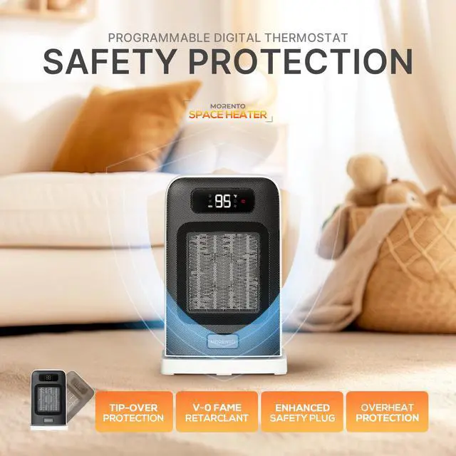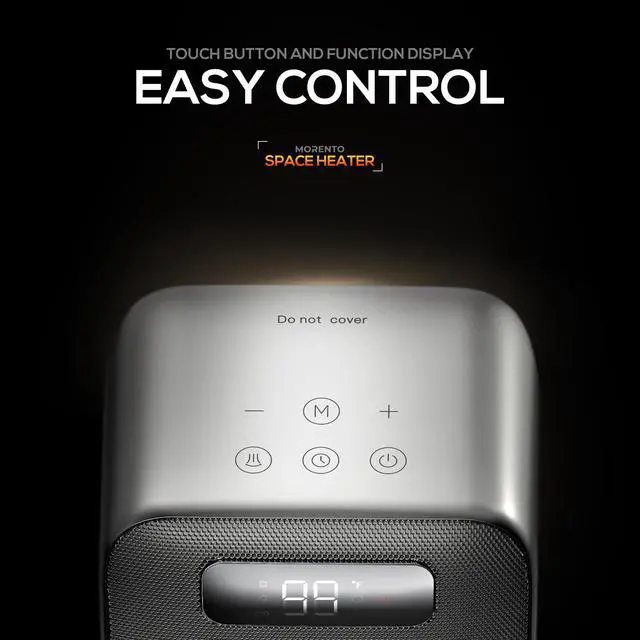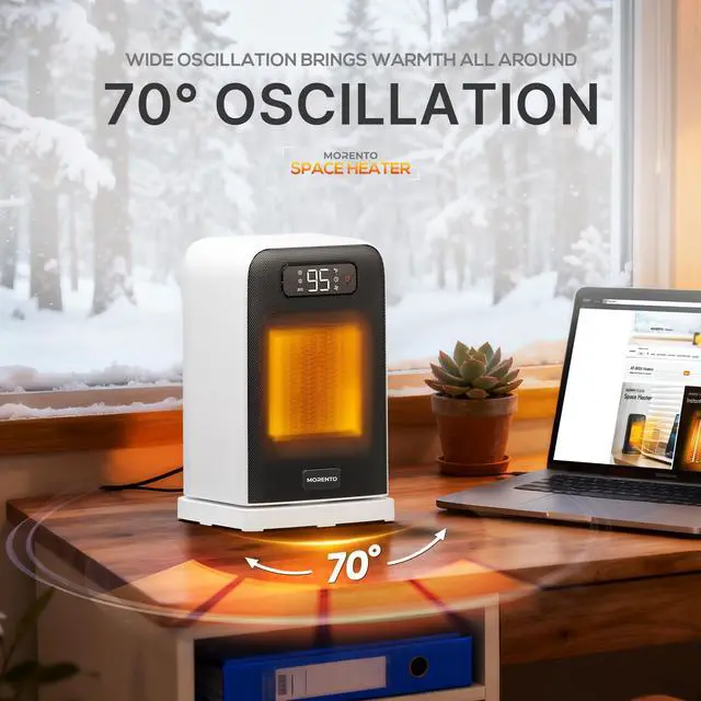 Morento space heater, with dual power modes of 1500/900W. It can quickly heat up a 200ft² room within seconds. Its operating speed can reach 6.5ft/s.