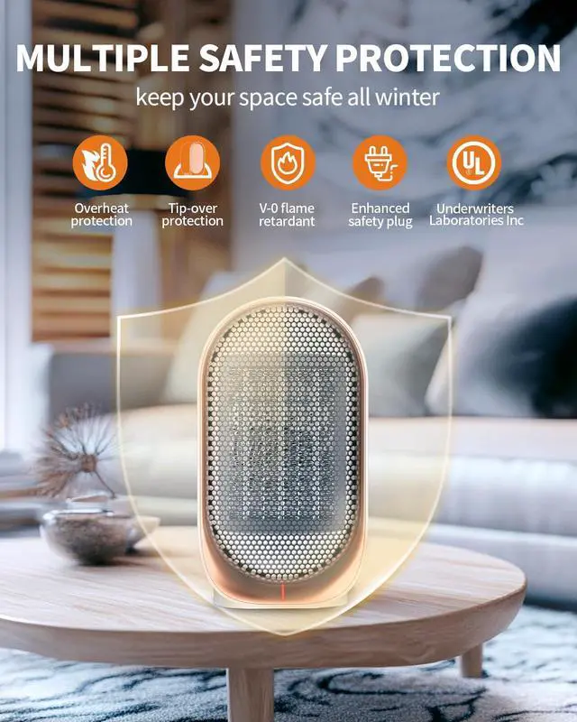 SAFETY PROTECTION FUNCTIONS ENSURE SAFE USE Small heater for indoor use quipped with a safety switch, auto shut-off activates at 45° tilt or overheating - UL-certified for USA safety standards.