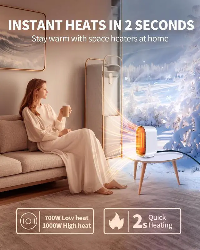 2-MODE HEATER FOR OFFICE & BEDROOMChoose between 1000W(High)/700W(Eco) modes. Energy-saving ceramic heater maintains ideal temperatures for workspaces or sleep environments helps maintain comfortable humidity levels.
