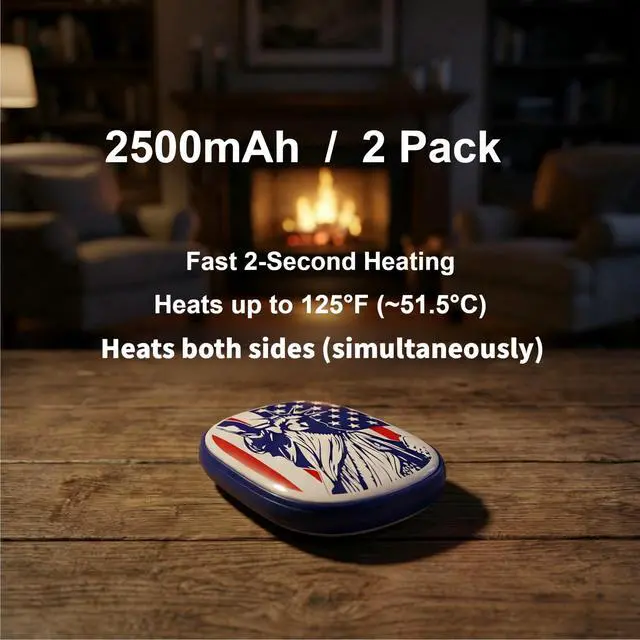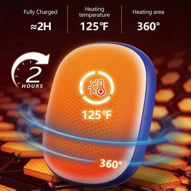 2 Pack Rechargeable Hand Warmers: 2500mAh rechargeable hand warmers provides up to 3 hours of steady double-sided heat up to 125°F.