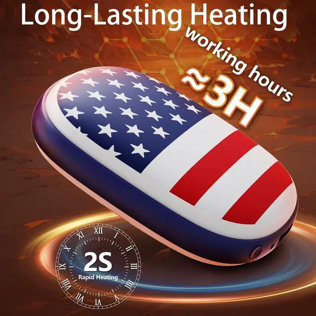 Special American flag desgin: Reusable hand warmer adopt new semiconductor heating materials and temperature control chips, the use of electric energy into heat, no fuel, no waste gas, sustainable. Our hand warmers have obtained UL, CE, and FCC safety certifications.