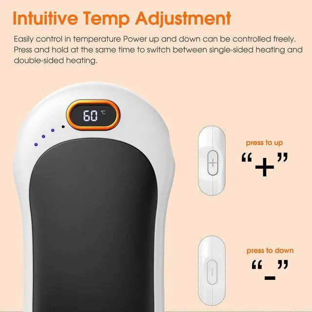 Dual-Heating Modes:Unlike the common hand warmers in the market,each piece stands out with its dual-heating modes-single-sided and double-sided heating.You can easily change these two modes with long press together of"+"and"-"buttons.The display screen shows the current heating temperature precisely.You can increase or decrease it according to your preference,with temp rang 104/40 to 140/60.This way,you can always enjoy the optimal level of warmth.(Press and hold"+"or"-" to power on and off)