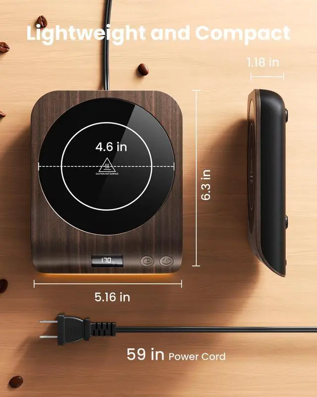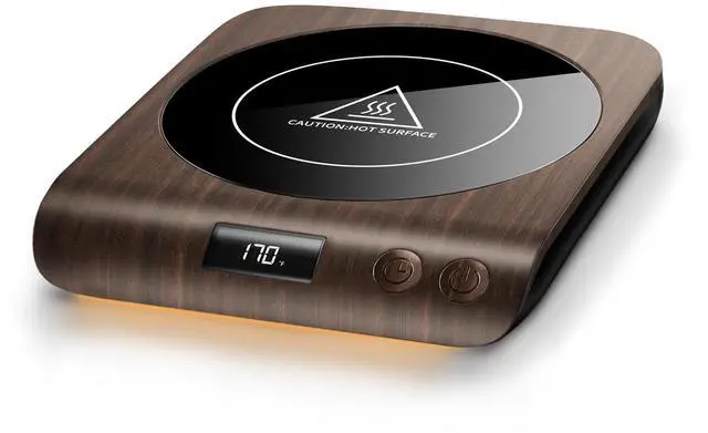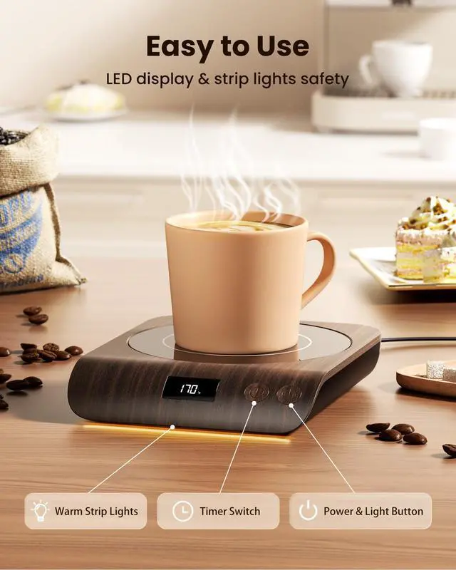 3 Temp and Ambient Lights: 50 W faster mug heater with 3 adjust temperature, 170, 150, 130, enjoy hot coffee all day long; LED display show the temp and timer, the strip warm light remind you of the working status, long press 3 S to turn off the lights