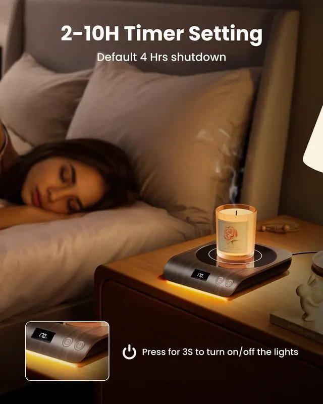 User Friendly Design: The candle warmer has LED display show the temp and working status; Water proof conductive glass surface, faster and uniform heating, easy to clean; Desk coffee warmer with large heat dissipation holes at the bottom to help dissipate heat