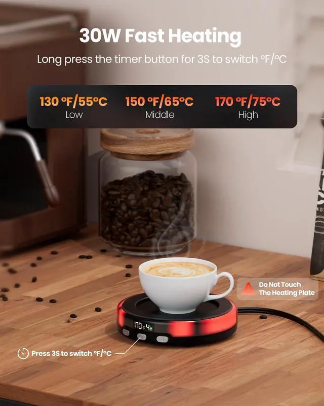 3 Temperature Settings: The 30 W coffer cup warmer with faster heating speed, one button easy to adjust the 3 temperature, 130 ,150 ,170 , keep your coffee at a constant temperature; The LED digital display show the temperature and timed