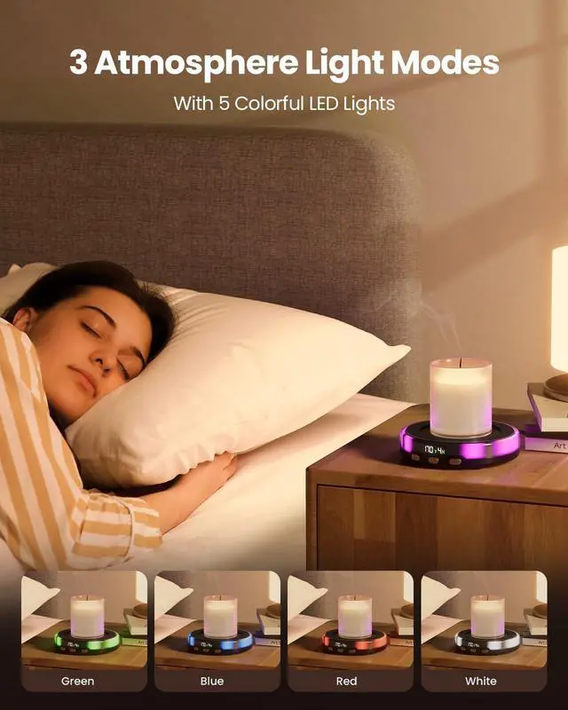Romantic Atmosphere Lights: Tea warmer with 3 lighting modes and 5 colors, multi color breath gradient light, monochrome breath light, monochrome constant light; Long press for 3 S to turn the lights, mug heater creates a romantic atmosphere in your home