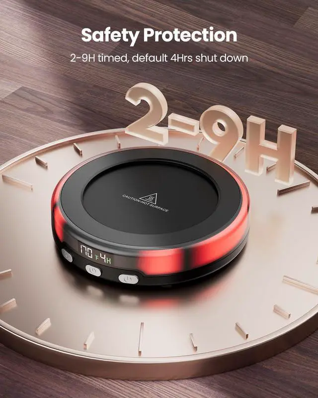 2 to 9 Hrs Auto Shut Off: The coffee heater has 6 options for timed shutdown, click the timer button to set it to auto shut down after 2, 3, 4, 6, 8, 9 Hrs; The cup warmer will automatically shut down after 4 Hrs by default, very safety and convenience