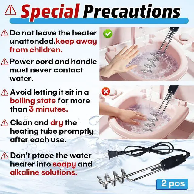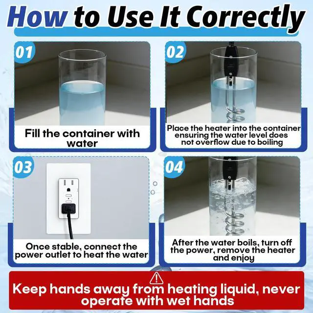 Critical Safety RemindersMust read before use,the heating coil must be fully submerged in water at all times during operation to prevent overheating or damage. Do NOT plug two or more heaters into a single power outlet to avoid circuit overload and potential safety hazards