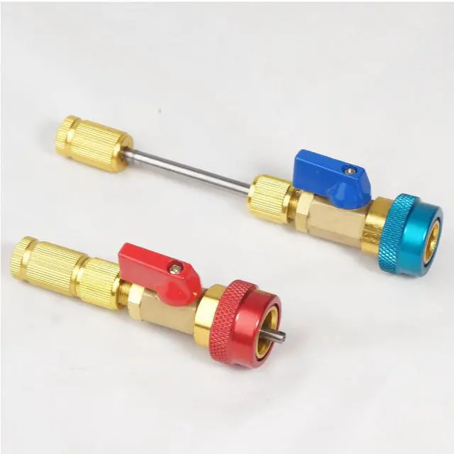 This professional-grade R134a AC valve core removal tool is designed for efficient servicing of automotive air conditioning systems. Crafted from durable brass with a distinctive red and gold finish, this vacuum-rated tool features a safety lock mechanism to prevent accidental refrigerant release. The precision-engineered design allows for quick removal and installation of valve cores while maintaining system pressure. The textured grip provides enhanced control during use, while the compact size makes it easy to access tight spaces in the engine bay. Perfect for both professional mechanics and DIY enthusiasts, this tool is compatible with standard R134a air conditioning systems found in most modern vehicles. The robust construction ensures long-lasting performance, while the vacuum-rated seal helps maintain system integrity during service operations. Save time and effort on AC maintenance tasks with this essential automotive tool.