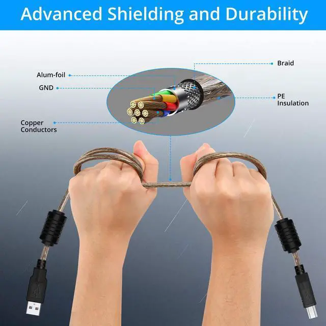 High-speed Transfer: Up to 480 Mbps transmitting data speed for USB 2.0 devices, USB 2.0 printer cord is backwards compliant with full-speed USB 1.1 and low-speed USB 1.3. Multiple layers shielding cable provides more stable data transmission and more efficient work way.
