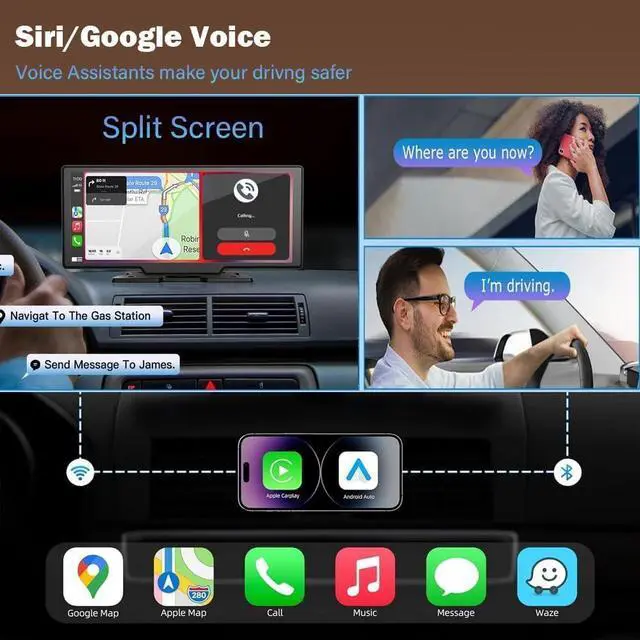 Portable Carplay-10.26" Screen Car Play-Wireless Apple Car Play & Android Auto,4K Dash Cam,1080p Backup Camera DVR,Audio Receivers GPS Navigation Mirror Link, Bluetooth,FM, Siri,SD Card