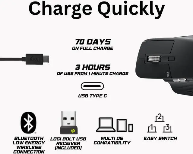 Connect Instantly, Charge QuicklyMX Master 3S for Mac stays powered for up to 70 days on a full charge and gets three hours of use from a one-minute quick charge. Use the included USB-C to USB-C charging cable to top up the power.
