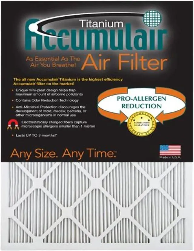 29.75 x 31.75 x1 (Actual Size) Accumulair Titanium 1-Inch Filter (MERV 13). Lasts up to 3 months. MERV 11 Rating. Disposable Pleated HVAC Filter. Electrostatically charged. Made in the USA.. This item has been restricted from sale in the following state (s): ['No']