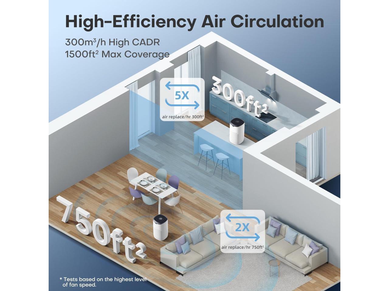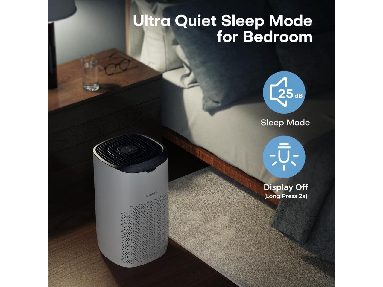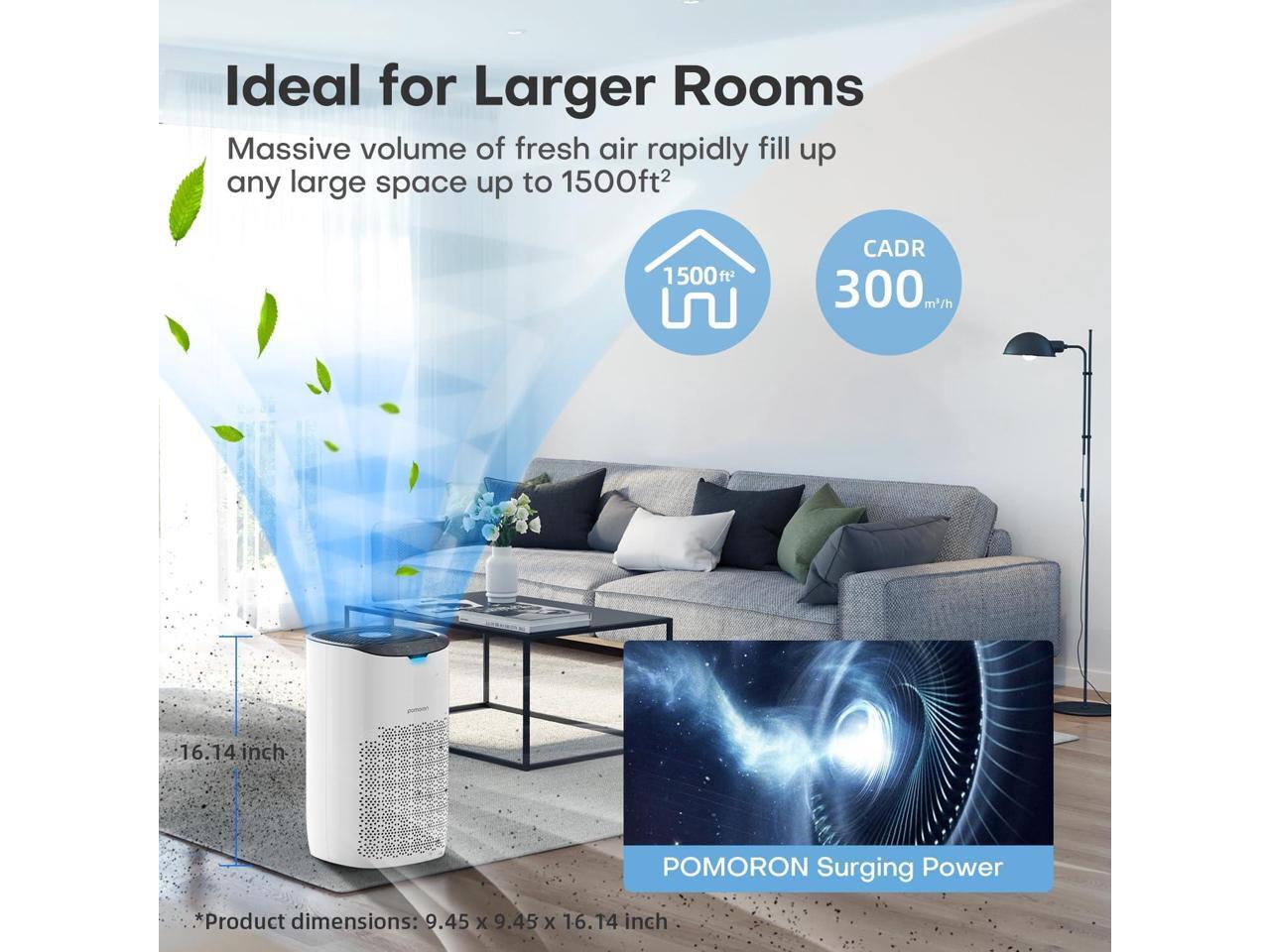 - High Performance-For Large Room Up to 1500Ft²: The top-performing Pomoron Model MJ003HD air purifier for home is designed with dual side air intake & large size air duct, significantly improves purification speed for large room. It has a high CADR of 300m³/h which can purify a 1500 ft² room 1 time an hour and a 300 ft² room 5 times per hour, rapidly fill up your room with tons of fresh air. (Product Dimensions: 9.45"D x 9.45"W x 16.14"H)