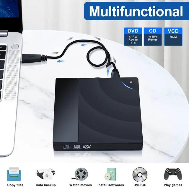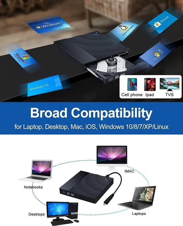 Wide CompatibilityThe external DVD drive is compatible with Windows 11/10/8/7, Windows SE / ME / 2000 / XP /Vista, Linux, and all versions of Mac OS. DVD disc drives also support different devices like Apple Macbook Air, Macbook Pro, iMac, and Desktops. You can use it to listen to music, watch movies, play games, burn/rip CDs& DVDs deta and install Software, etc.
