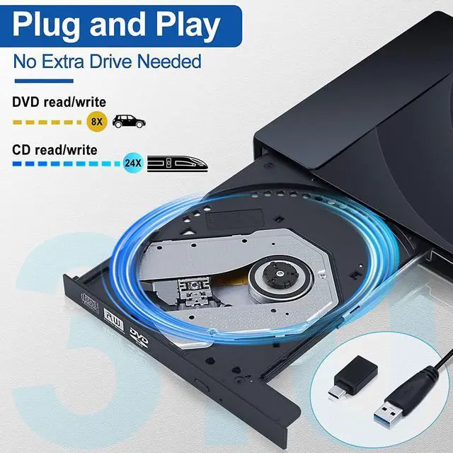 USB 3.0 High-speed TransmissionThis portable CD/DVD drive is equipped with embedded USB 3.0 and USB-C two kinds of connectors. you can use it without an adapter or hub required which provides Max 8x DVD Read/Write Speed, and Max 24x CD Read/Write Speed. It's faster 900% than USB 2.0.