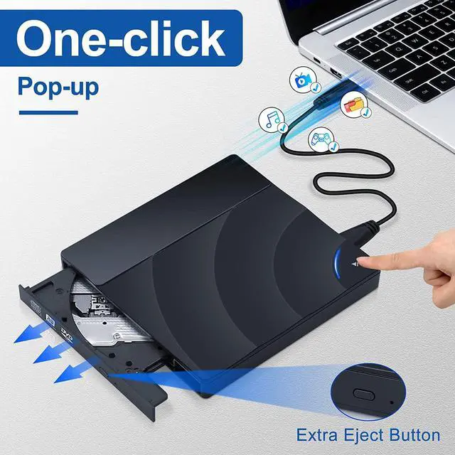 Ingenious Design This ultra-slim CD/DVD player for laptops equipped with an eject button and a one-touch popup button so that you needn't worry about your disc getting stuck inside this external CD/DVD drive. Besides, the copper mesh technology of this external component, you can be rest assured of stable data transmission andto read and write CDs and DVDs quietly without stuttering and noise, and won't damage your discs.