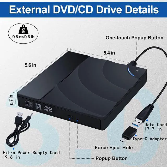 Portable and easy to useJust plug it into your laptop or desktop computer's USB and Type-C ports and the CD/DVD drive will be automatically recognized, no extra driver program required! So portable and lightweight to carry that you can easily use it in the office, school, at home, even during a trip.