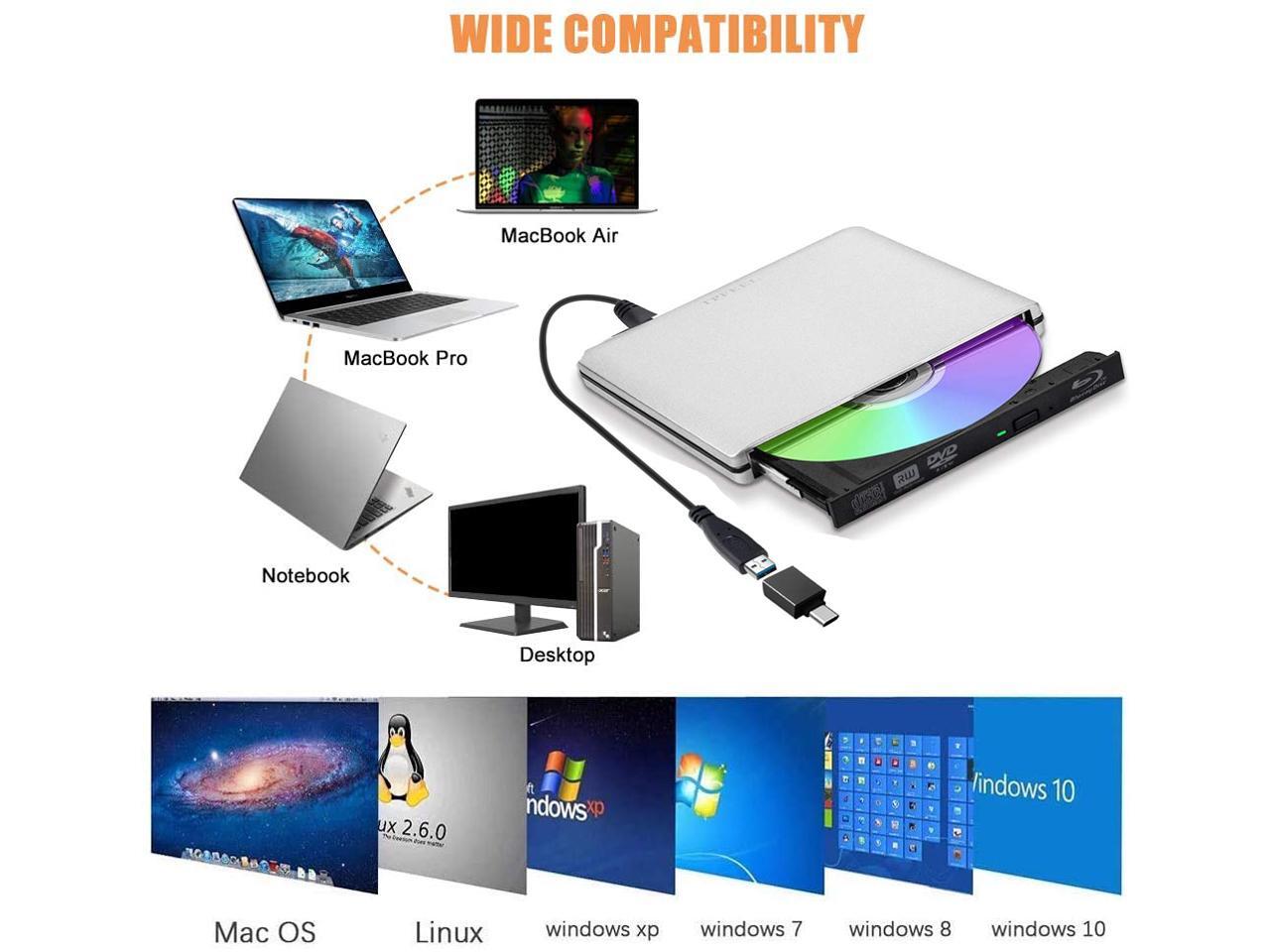 Jansicotek Aluminum External Blu-Ray Player Drive Portable CD/DVD ROM +/-RW Optical Drive Player Reader Writer Burner for Windows 10/8/7, Linux, Mac Laptop Desktop PC, MacBook Pro/ Air, iMac, Silver